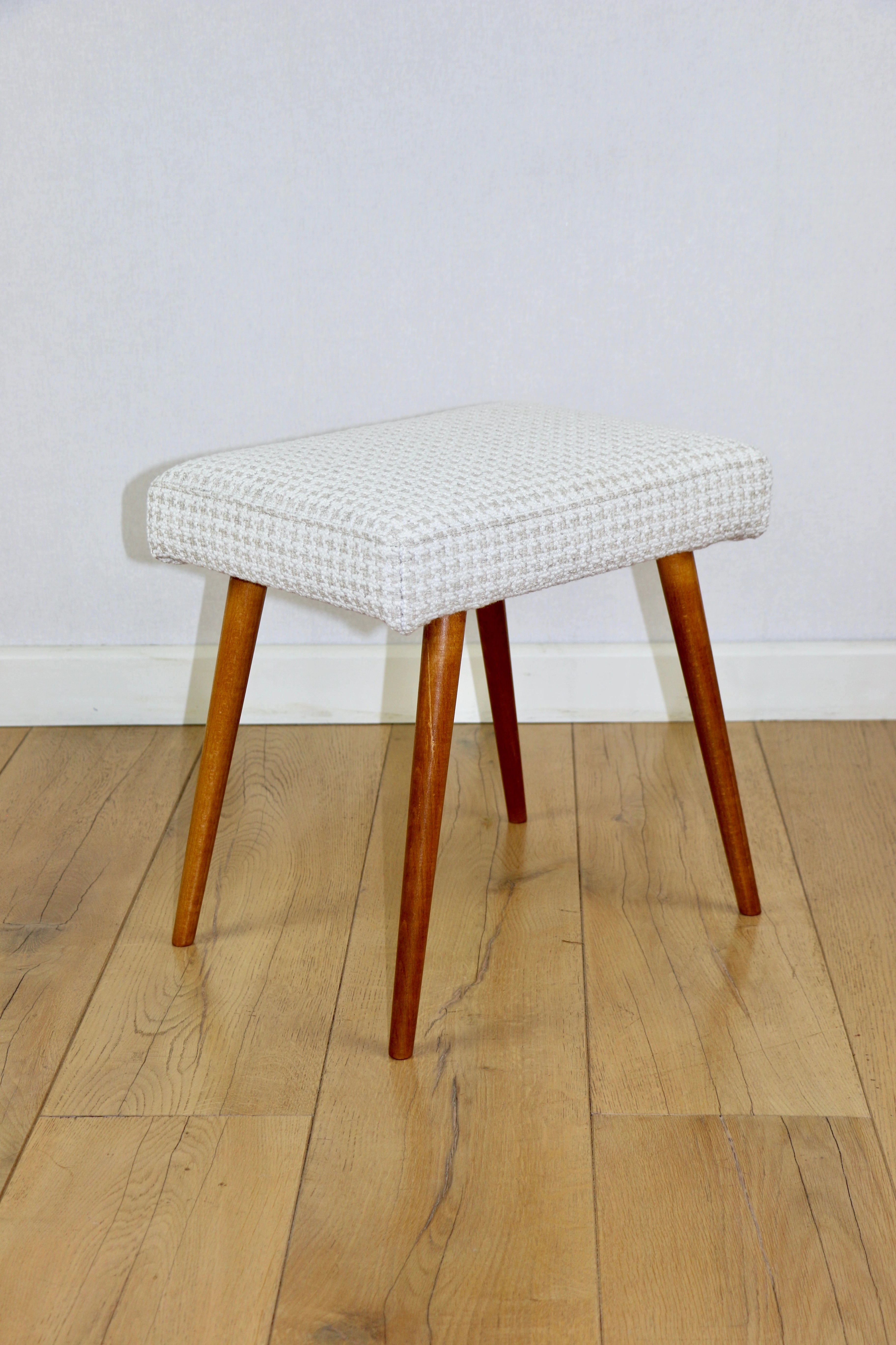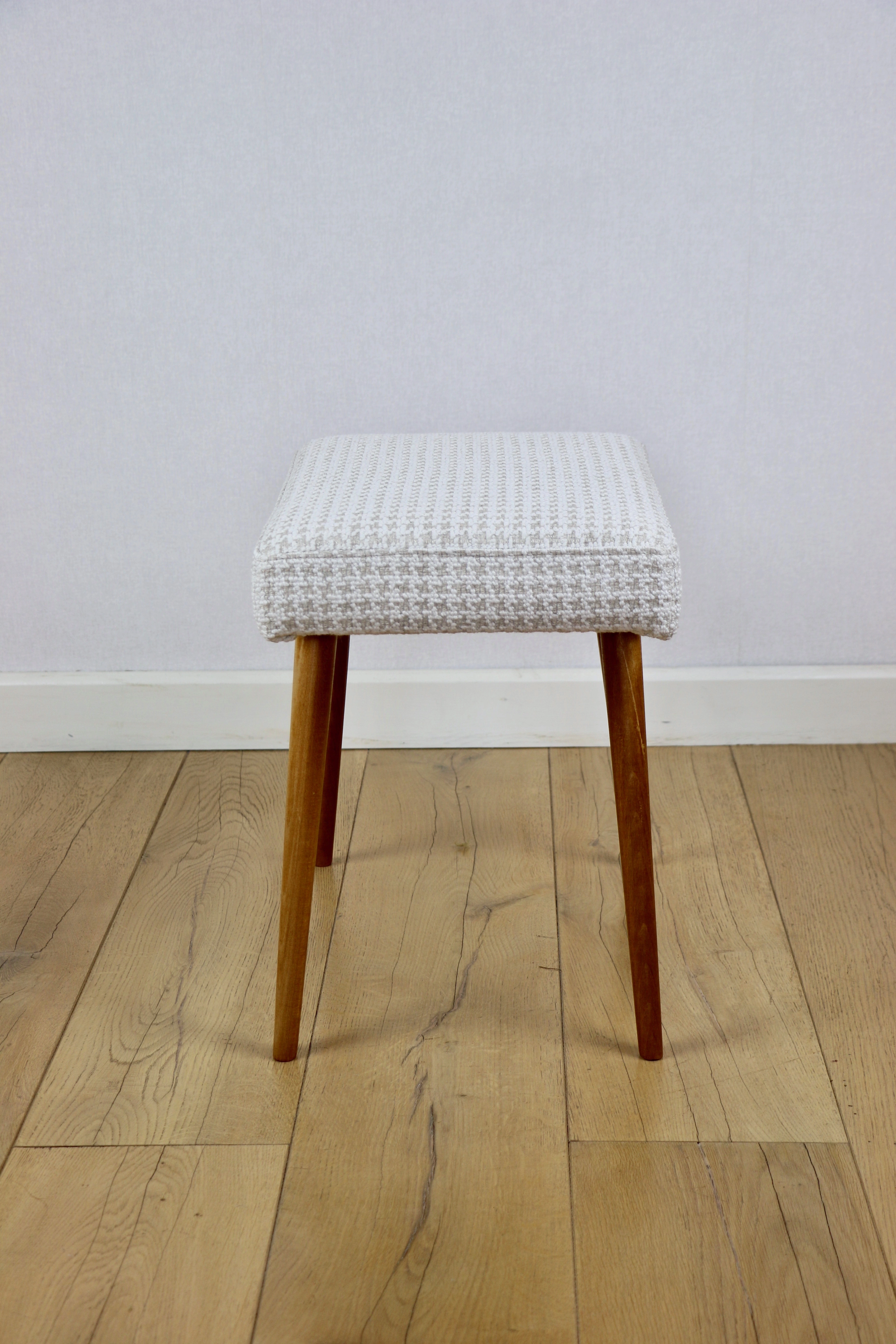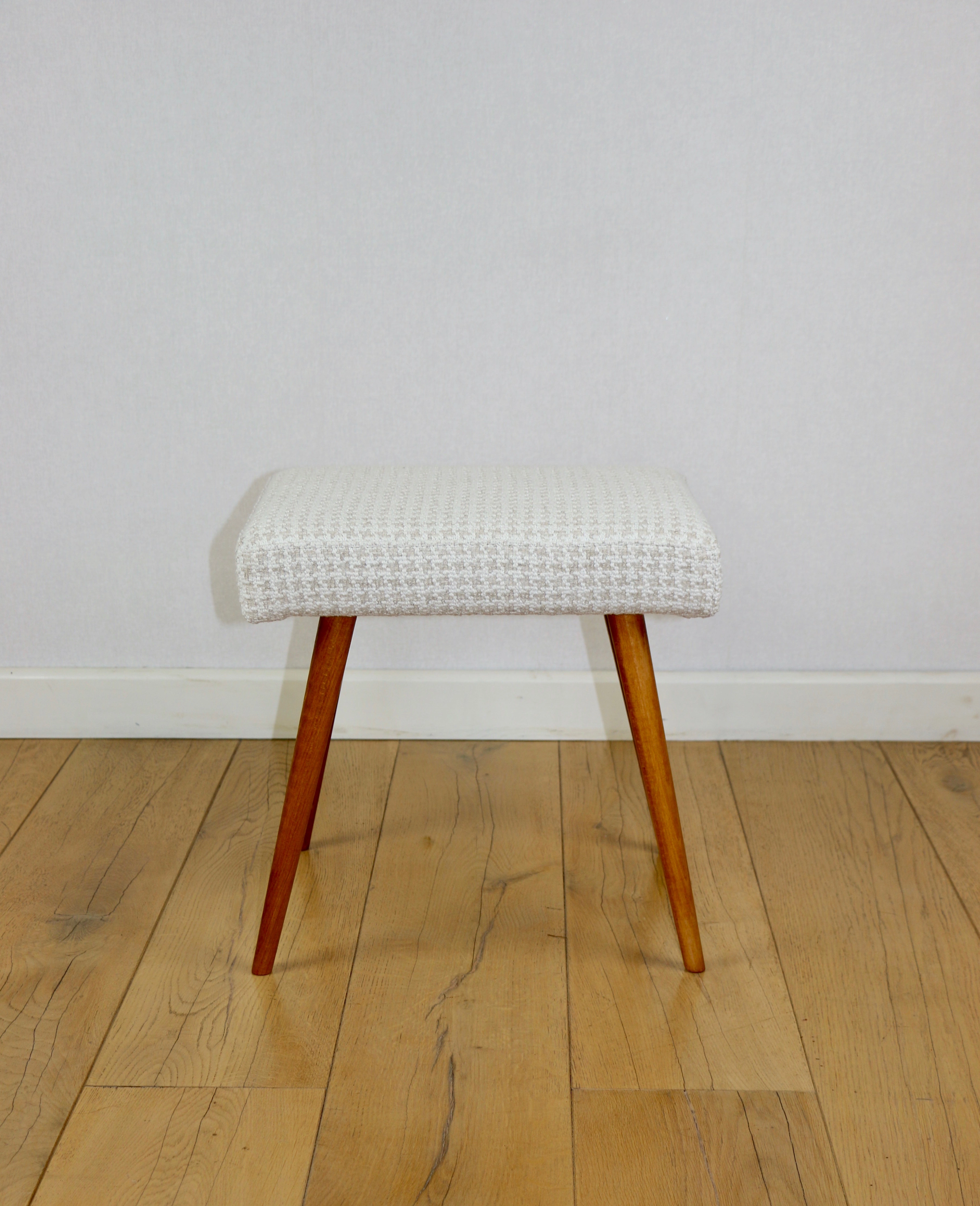 Taboret vintage produkowany w latach 70tych. Całkowicie odnowiony, obicie w strukturalnej naturalnej tkaninie - jodełki w kolorze beżowym. Nóżki drewniane bukowe w naturalnym kolorze - woskowane - okrągłe, które podkreślają kształt i charakter siedziska.