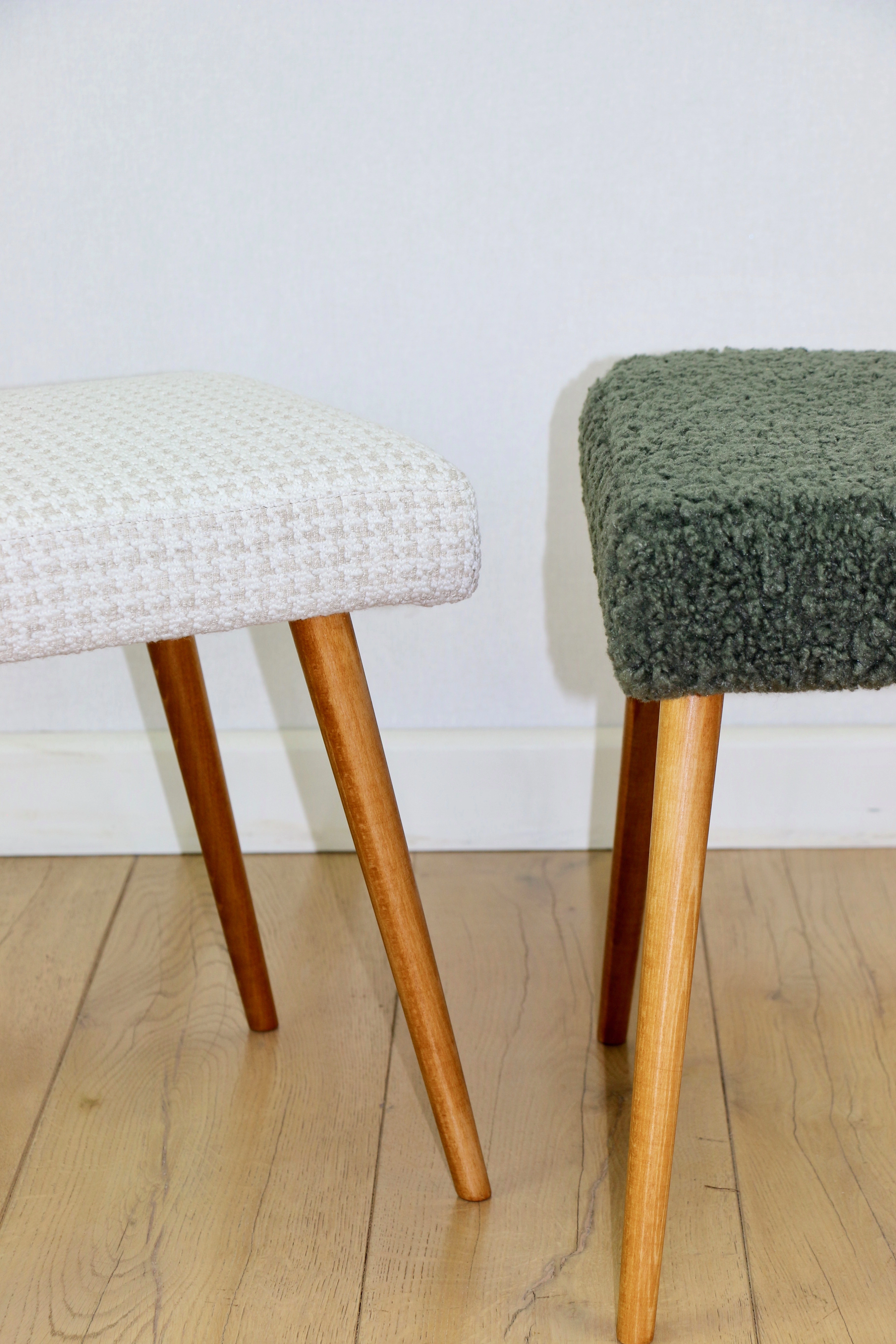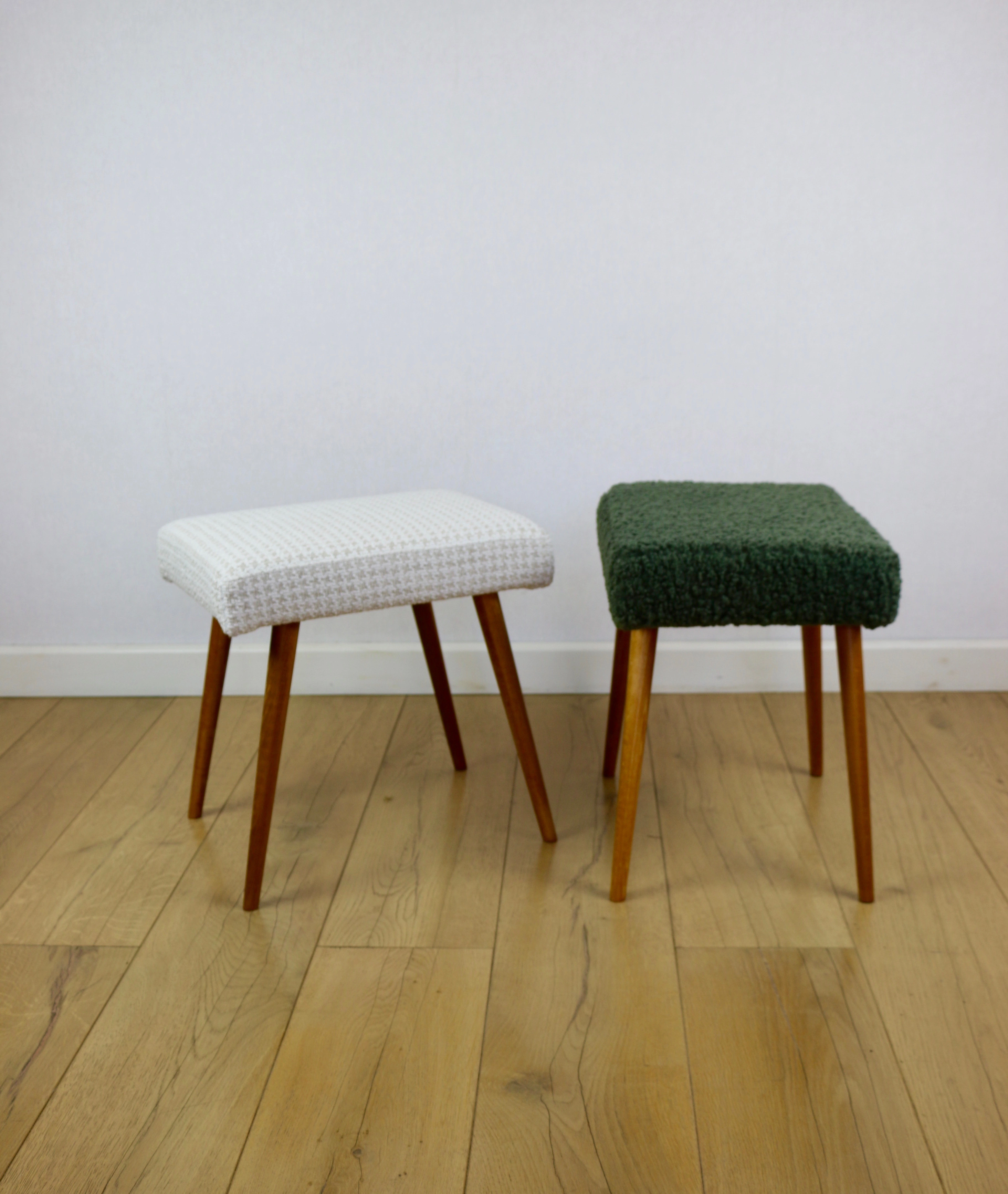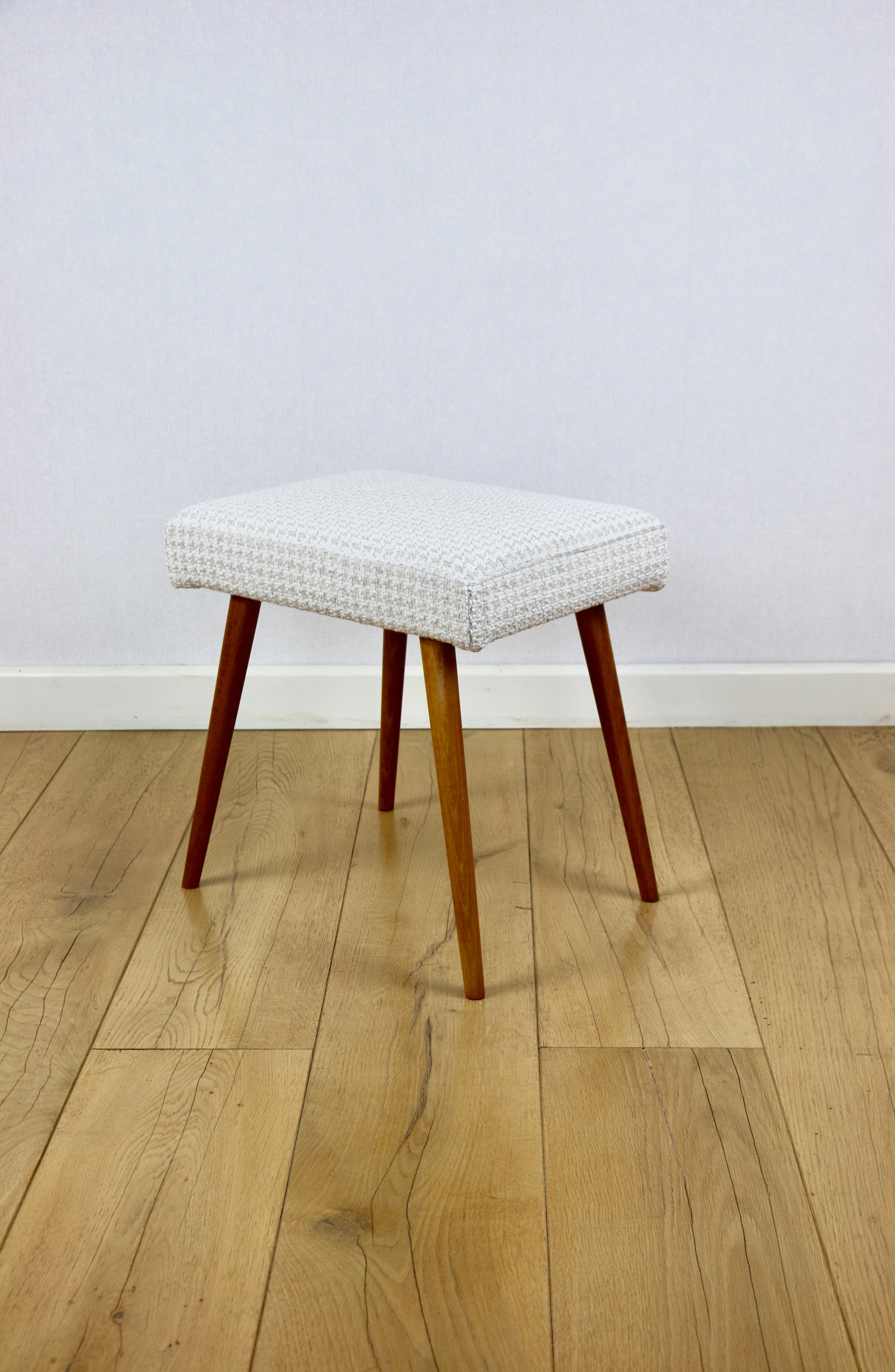 Taboret vintage produkowany w latach 70tych. Całkowicie odnowiony, obicie w strukturalnej naturalnej tkaninie - jodełki w kolorze beżowym. Nóżki drewniane bukowe w naturalnym kolorze - woskowane - okrągłe, które podkreślają kształt i charakter siedziska.