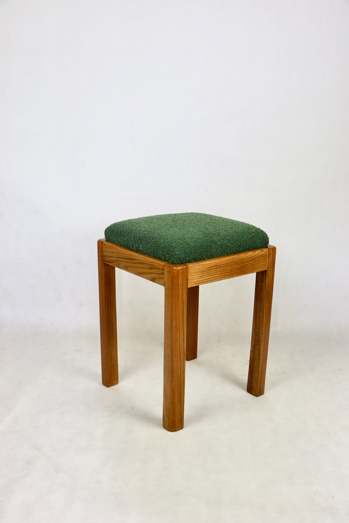 Taboret Vintage produkowany w lata 70 tych. Całkowicie odnowiony, obicie w strukturalnej tkaninie z serii boucle. Nóżki drewniane lakierowane naturalnym kolorze - drewno bukowe.