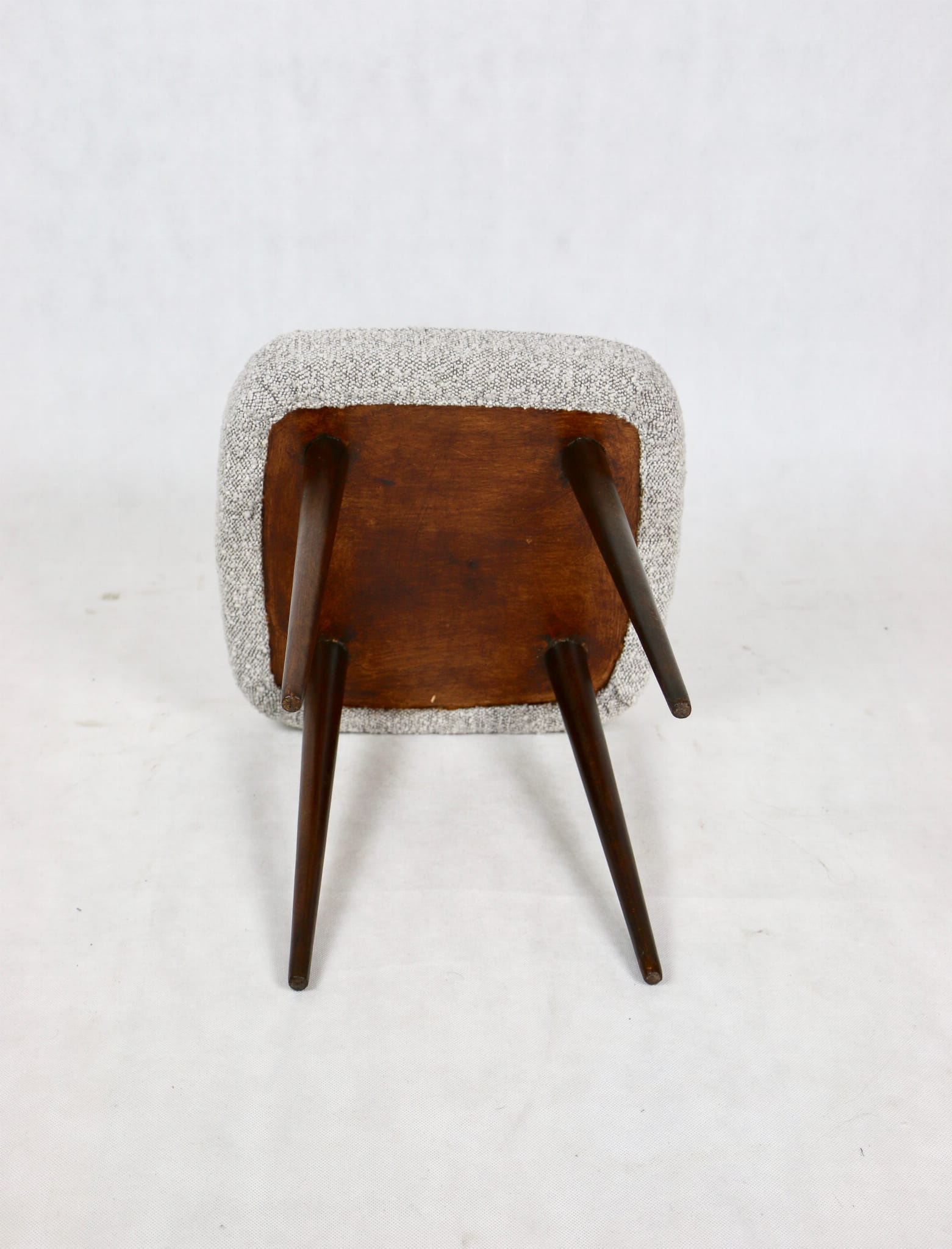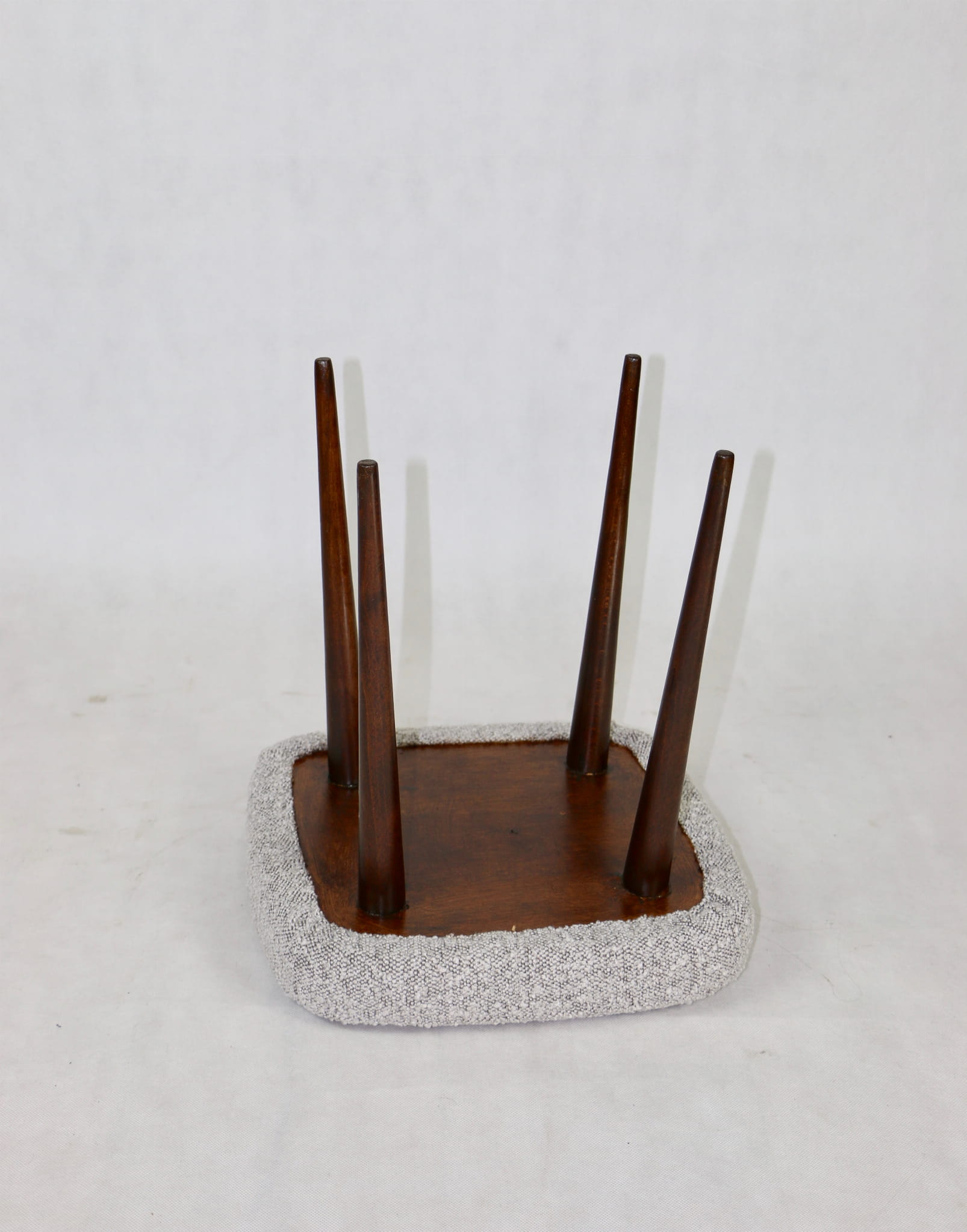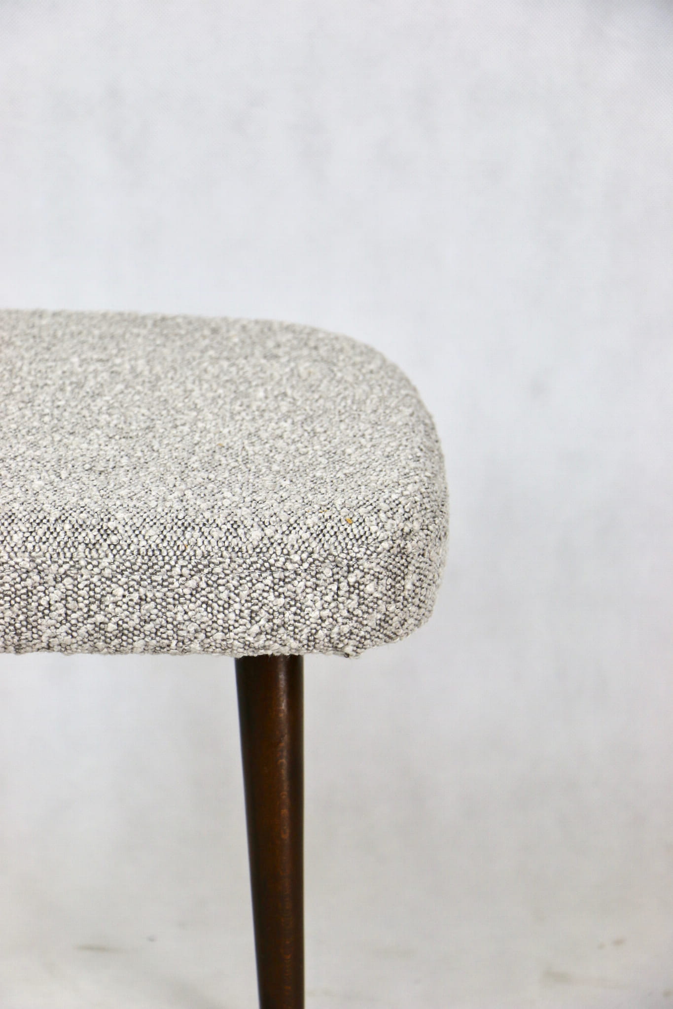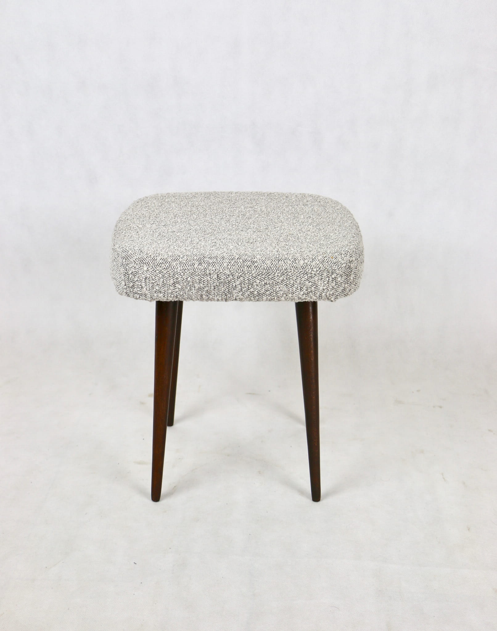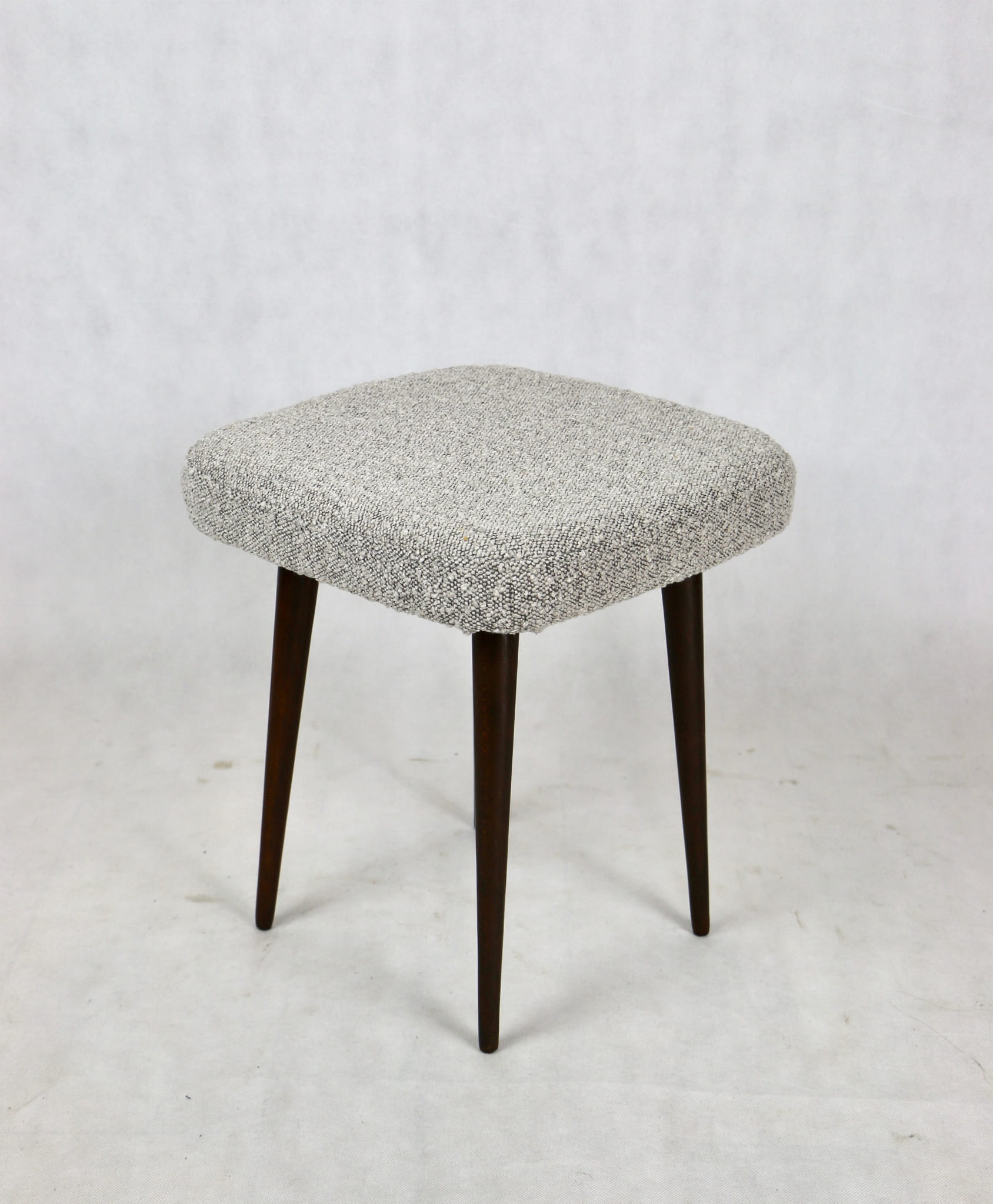 Odnowiony taboret, kwadratowy, nowe obicie strukturalne - boucle w kolorze szarym.