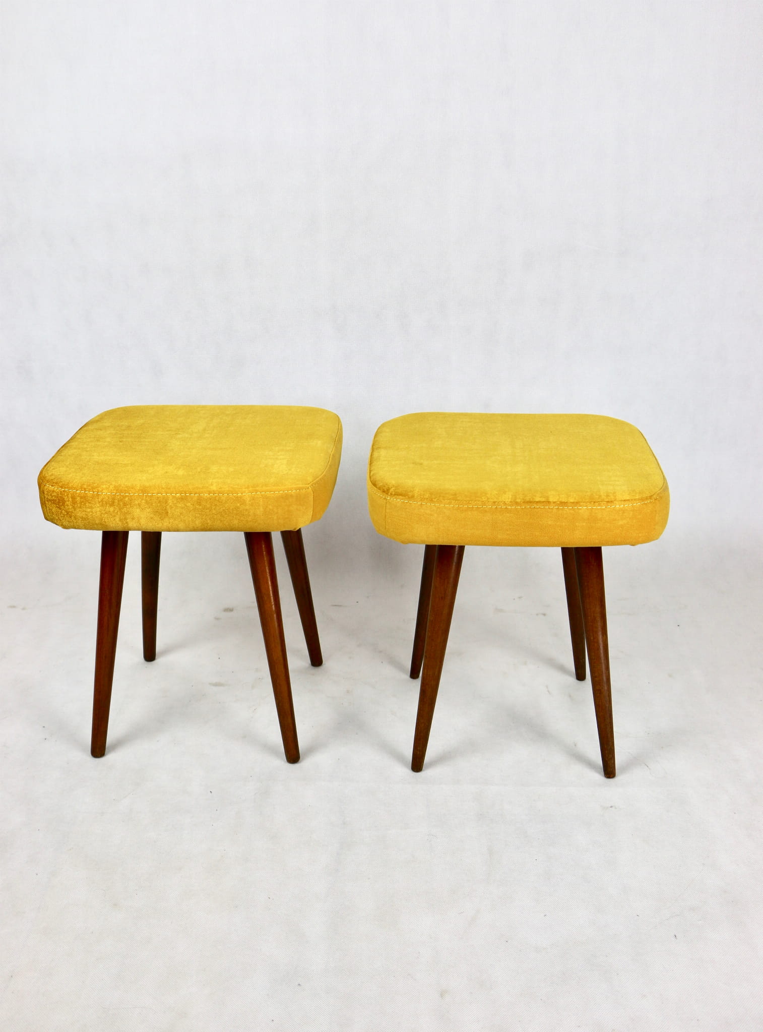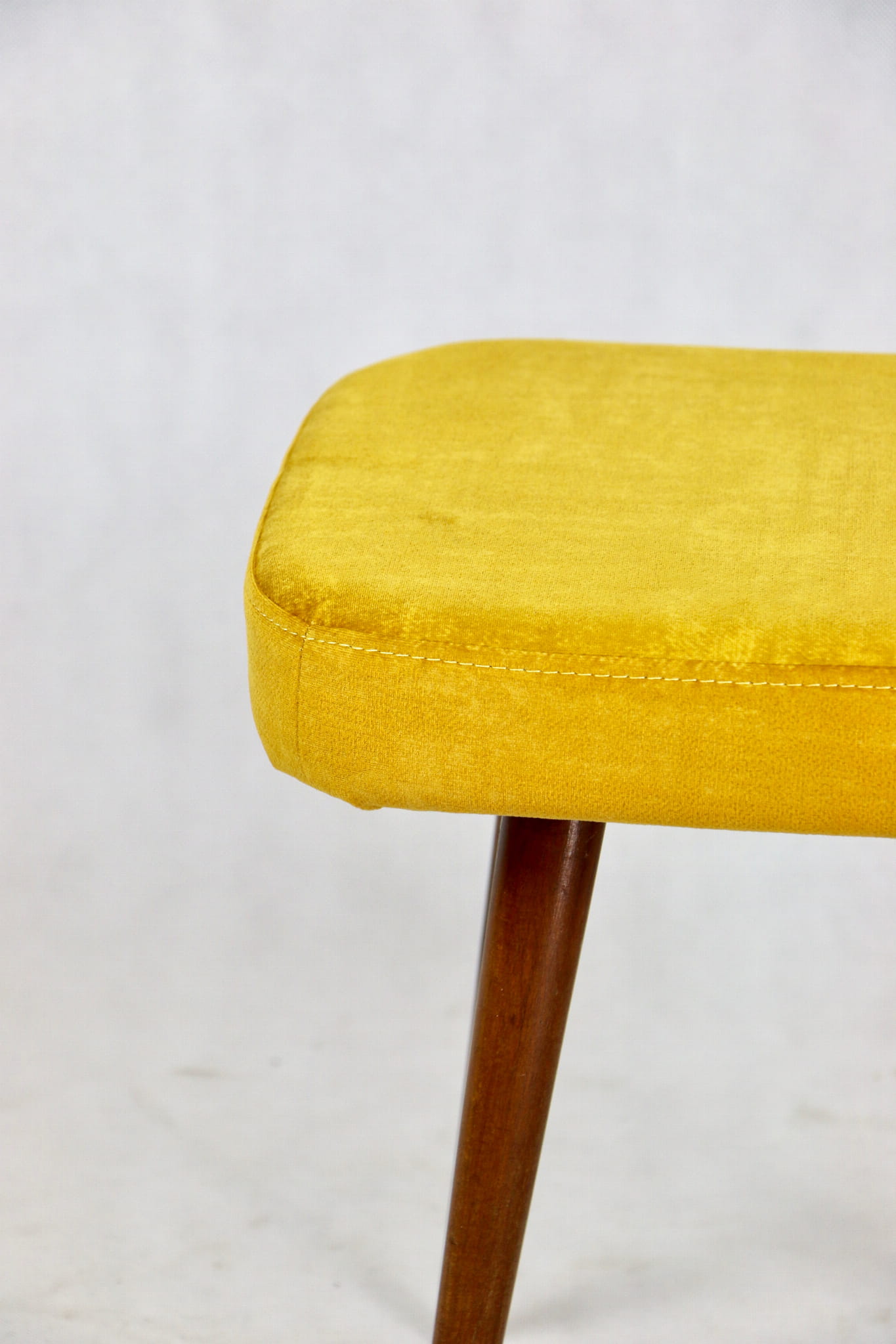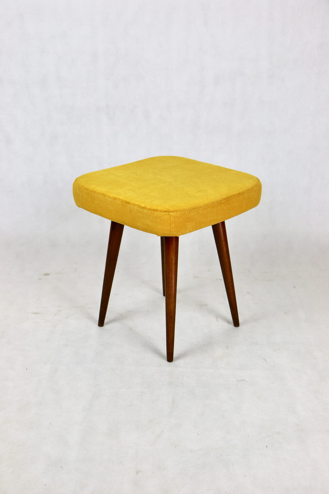 Odnowiony taboret, kwadratowy, nowe obicie strukturalne welwet w kolorze żółto - złotym z serii Chameleon.